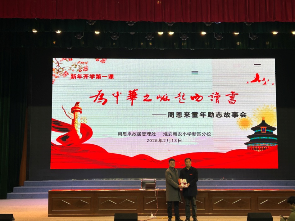 活动中,周恩来故居管理处向淮安市新安小学新区分校赠送了《为中华之崛起而读书——周恩来励志故事》《周恩来的青少年时代》图书及《系好人生第一扣——周恩来的家风故事》文献纪录片,鼓励同学们多读书、读好书,以周恩来总理为榜样,从小树立远大理想,明确自己的人生目标,并为之奋斗,做一名拥有“四个自信”的时代新人。(祖琦)