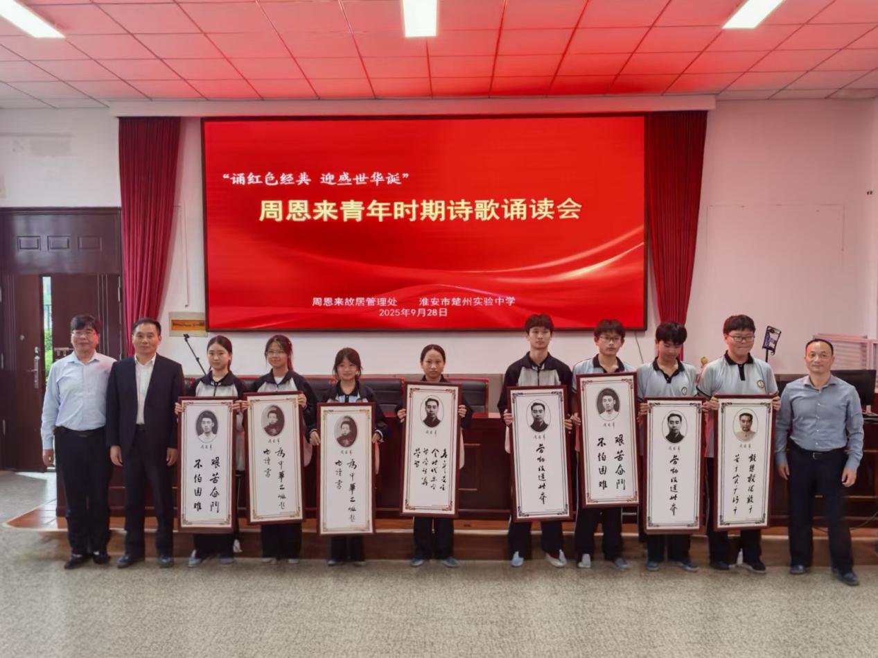 为庆祝中华人民共和国成立76周年,深入学习贯彻习近平总书记关于“大思政课”与青少年成长的重要论述精神,弘扬周恩来同志的崇高品格与家国情怀,9月28日下午,周恩来故居管理处联合淮安市楚州实验中学,共同举办“周恩来青年时期诗歌诵读会”。周恩来故居管理处主任李子权、副主任陈国冠,楚州实验中学校长徐小明以及近300名师生代表共同参加此次活动。