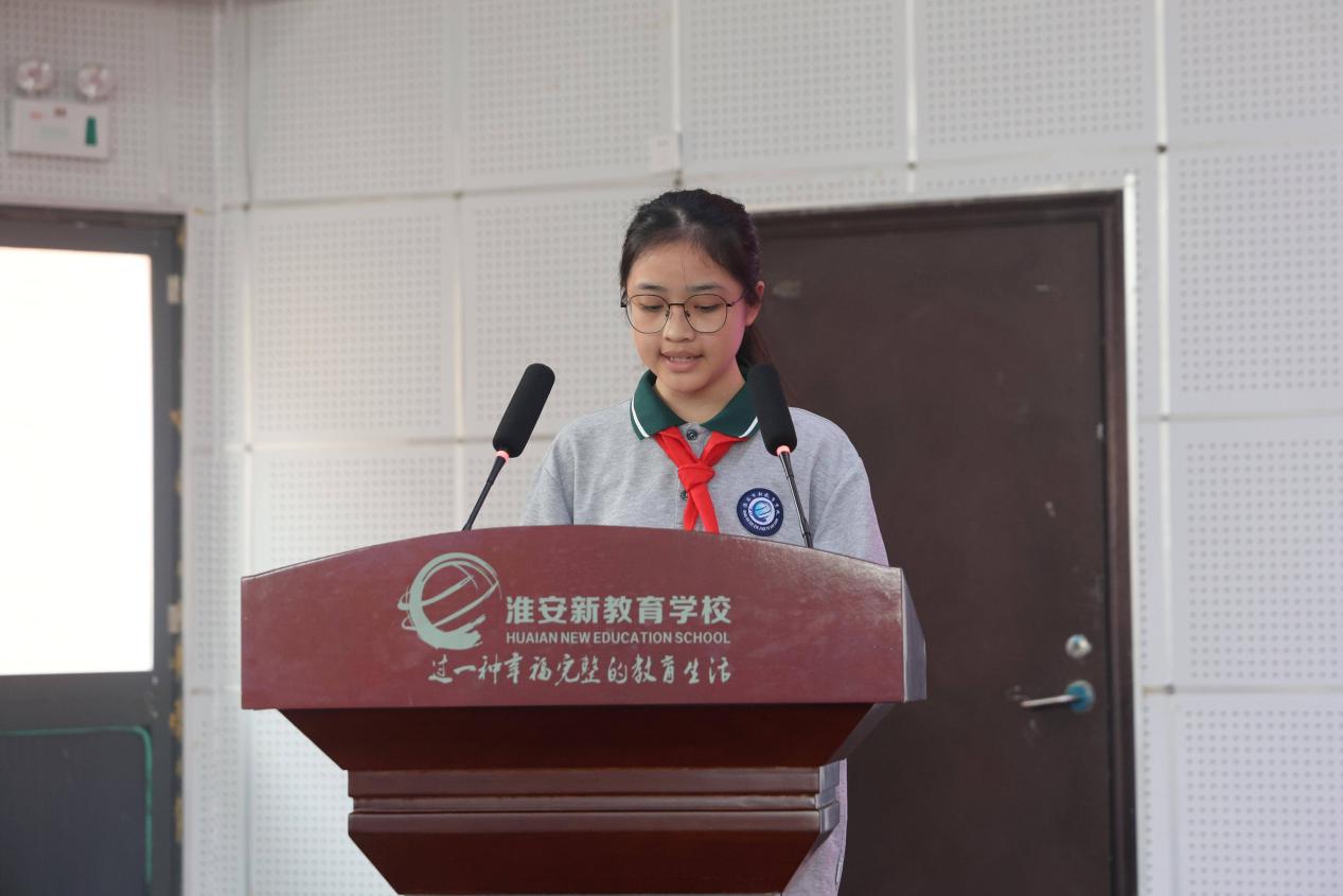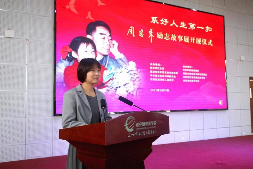 淮安市新教育学校学生代表苏芸在活动中发言,表达了对周恩来总理的深切缅怀与崇高敬意。她表示将不辜负长辈与社会期许,以周总理精神为指引,在学习中刻苦钻研、生活中严于律己,坚决“系好人生第一扣”,努力成长为有理想、敢担当、能奋斗的新时代好少年。