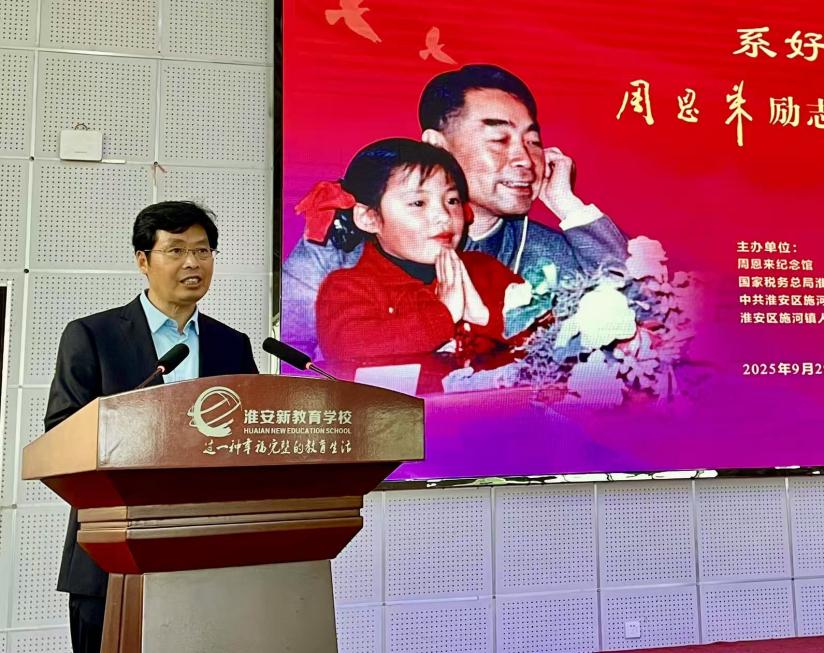 国家税务总局淮安市税务局副局长张杰受邀讲话,结合周恩来总理“严于律己、廉洁奉公”的崇高品格,深入解析税收工作与民生发展的紧密联系。他以“学校教学楼、崭新课桌椅”等实例,生动阐释“税收取之于民、用之于民”的内涵,让同学们直观感受税收在国家发展中的重要作用。同时,他勉励学生以周恩来总理为楷模,“系好人生第一扣”,树立远大志向,成长为堪当民族复兴大任的时代新人。