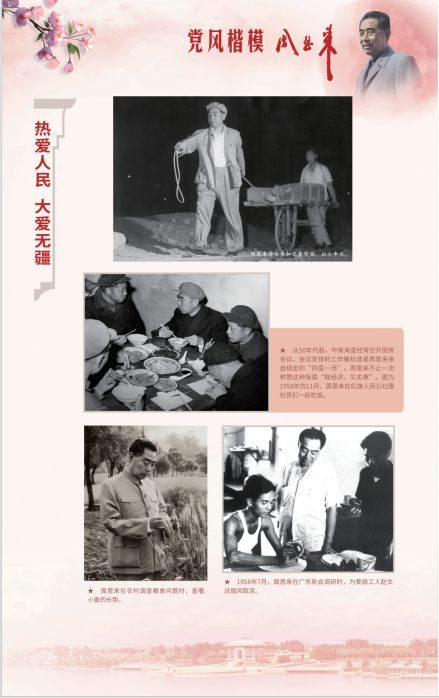 展览分为坚守信仰、对党忠诚,维护大局、勇于担当,热爱人民、大爱无疆,严于律己、清正廉洁四个部分,通过150余幅经典的历史照片及部分珍贵的文物、文献、油画等,多角度、深层次、立体化地展示周恩来一生信仰坚定、心底无私、天下为公的高尚人格和一身正气、两袖清风、自觉接受监督的崇高风范,集中展现了党风楷模周恩来的光辉形象。