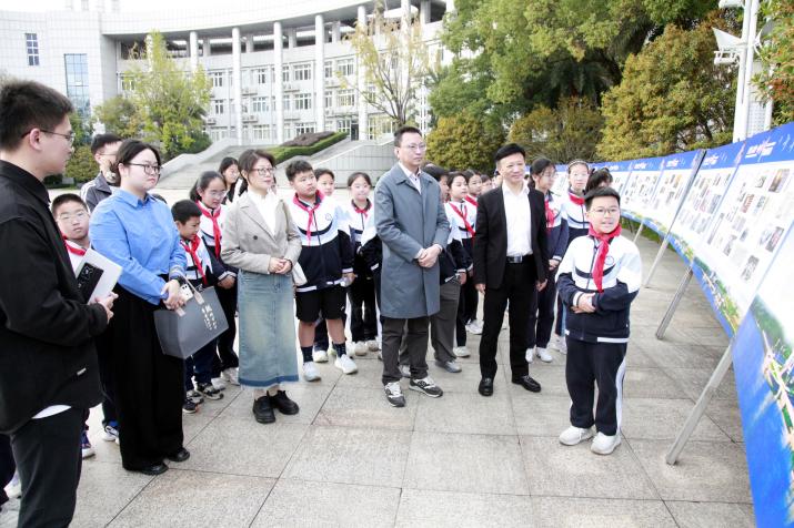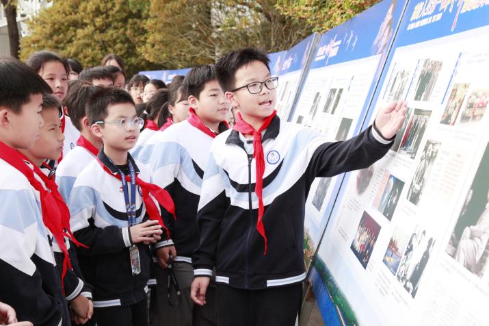 开幕式结束后,师生们有序参观展览。永嘉翔宇小学的六名学生担任讲解员,他们围绕“立志图强、忠诚爱国、坚守正义、诚实守信、文明友爱、敬业奉献”六大展览主题,结合300余张珍贵历史图片和一系列励志故事,生动解读展板内容,吸引了众多师生驻足聆听。
