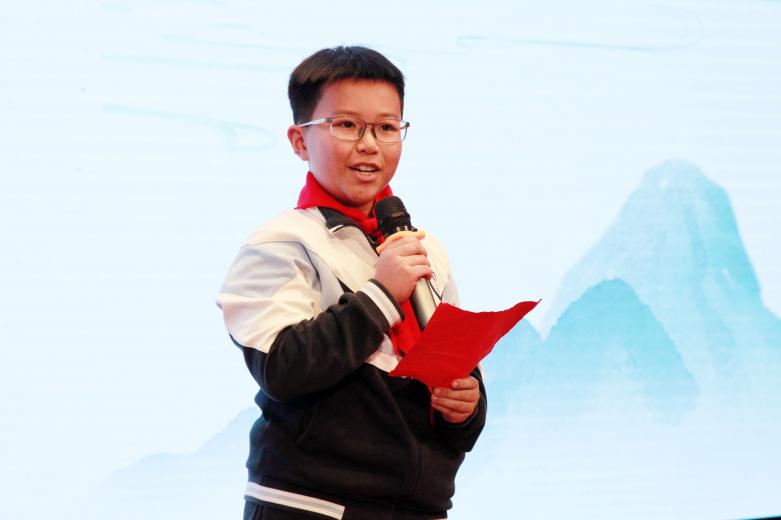 永嘉翔宇小学学生代表汤乾皓结合自身感受,讲述了新时代青少年如何以周总理为榜样,树立远大理想,努力成长为有理想、敢担当、能奋斗的新时代好少年。