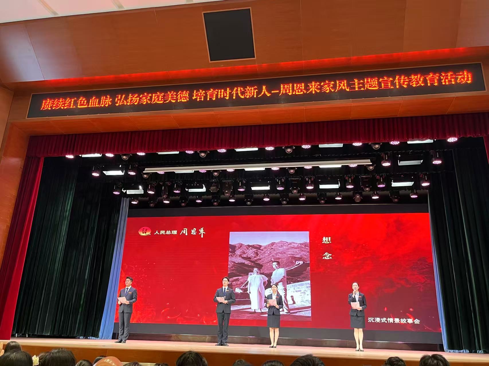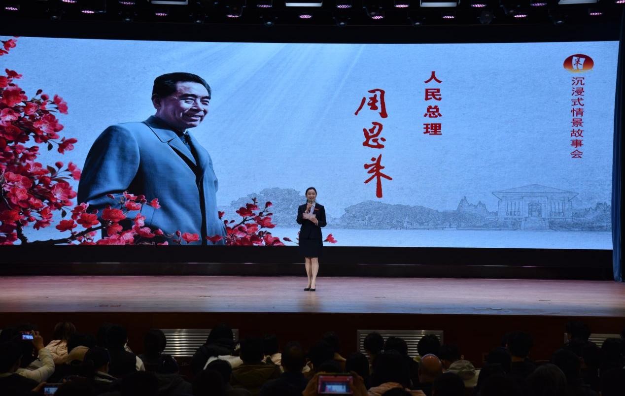 上午10时,《人民总理周恩来》沉浸式情景故事会在学校礼堂精彩展演,学校联合党委常委、宣传部部长王平主持。联合党委常委、副校长顾秀根致欢迎辞。他对中央党史和文献研究院第二研究部青年理论学习小组、周恩来纪念地领导和专家的到来表示热烈的欢迎;他表示,本次活动是深化落实党中央和教育部关于“大思政课”建设与实践教学要求的关键举措,周恩来同志的革命实践和家风故事是最鲜活、最感人、最有说服力的“大思政课”优质红色资源,希望通过本次活动,将宝贵的红色资源转化为课堂上的生动案例、实践中的行动指南,引导学生从革命事迹中坚定理想信念,从优良家风中涵养品德修为,成长为有理想、敢担当、能吃苦、肯奋斗的新时代青年。