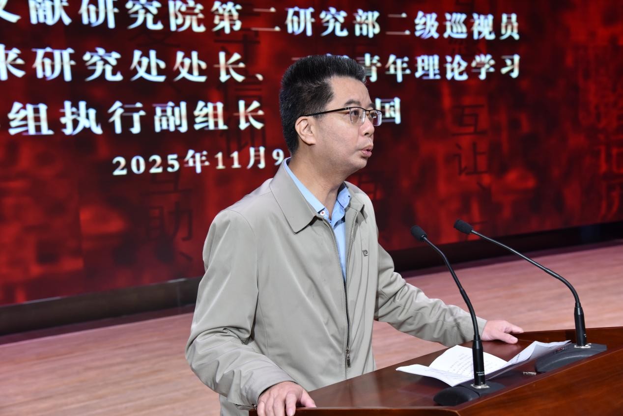 中央党史和文献研究院第二研究部二级巡视员兼周恩来研究处处长、二部青年理论学习小组执行副组长潘敬国以周恩来邓颖超结婚100周年为契机,围绕“家是最小国,国是千万家”的核心理念,深刻阐释了红色家风的时代意义。他引用周恩来同志的五个“不虚度”、新年计划、修养要则等经典语录与在场师生共勉,鼓励青年一代修身齐家、求知向学、勇担社会责任,在新时代传承好红色基因。