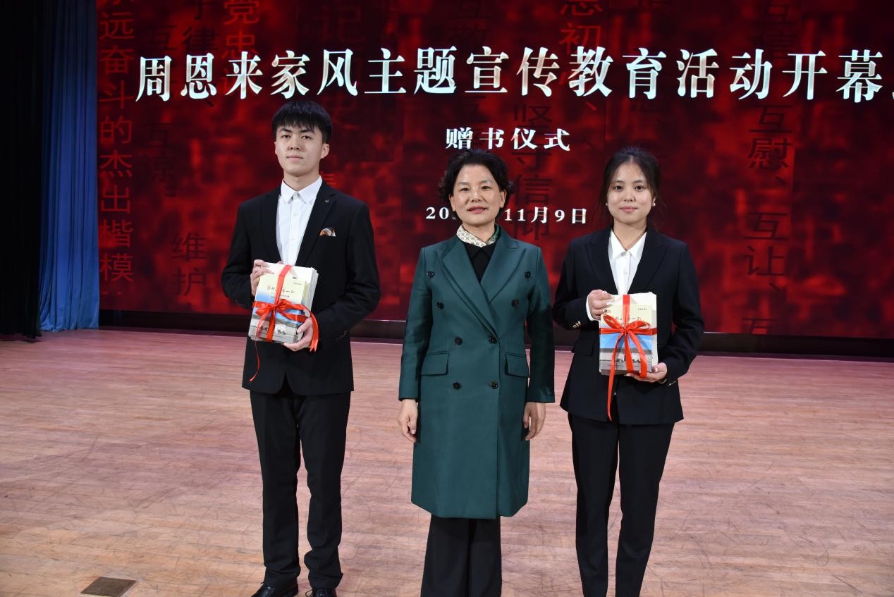 祁素娟局长代表周恩来纪念地向学校赠送《为中华之崛起而读书:周恩来励志故事》书籍与《系好人生第一扣——周恩来的家风故事》文献纪录片,为青年学子送上丰厚的精神食粮。
