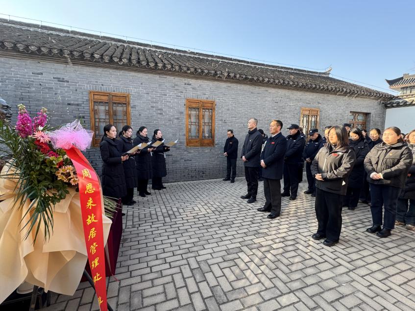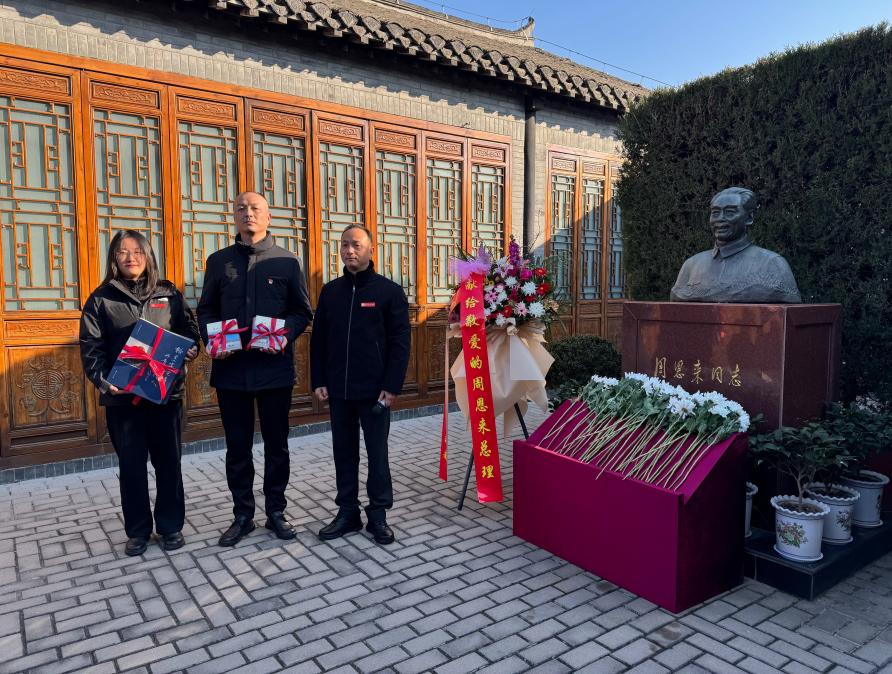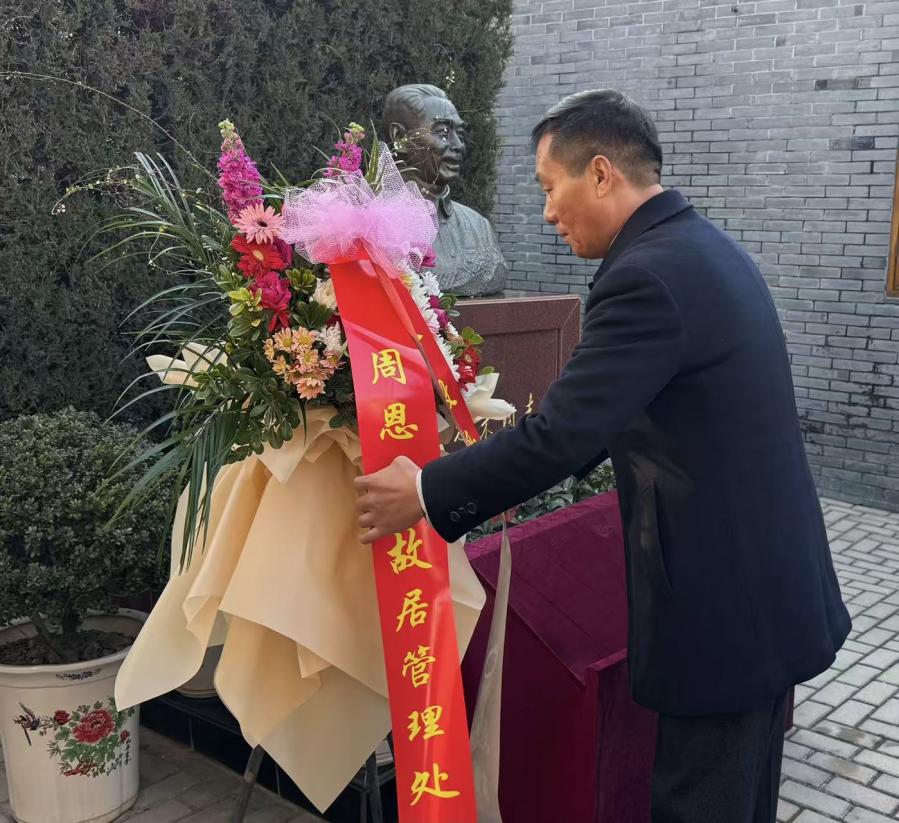 活动现场,松枝苍翠,花篮静立。故居管理处主任李子权缓步上前,仔细整理花篮缎带,鲜红的缎带在晨光中熠熠生辉,承载着对总理的无限敬仰。全体人员肃立默哀,向周恩来铜像三鞠躬,并依次敬献鲜花,寄托哀思之情。