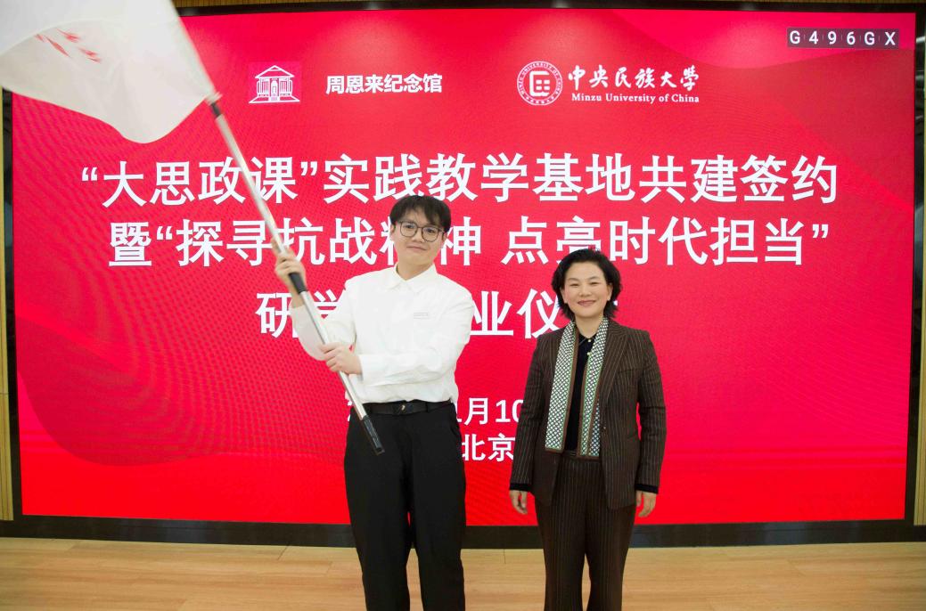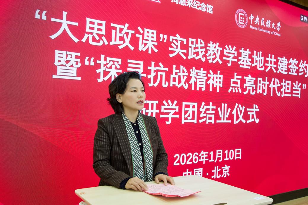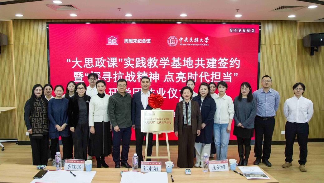 中央民族大学马克思主义学院党委书记、院长孔新峰在讲话中指出,此次共建是对习近平总书记新年贺词家国寄语的生动回应,更是对周恩来总理的深切缅怀。他强调,周恩来总理是共产主义远大社会理想和中华优秀传统文化大人君子人格的“道成肉身”,是“行走的‘第二个结合’”,其民族工作理论与实践影响深远,更亲自主持擘画了中央民族大学立校蓝图。研学之旅是思想与历史交融的信仰淬炼,学子在四地行程中收获真理与人格的双重力量。此次校馆共建,是落实立德树人根本任务、推进“大思政课”建设的重要实践,学院将认真履约,合作共赢,引导广大学子以研学所得为动力,传承红色基因与民族团结精神,以奋斗实干书写无愧于时代、无愧于人民的璀璨篇章。