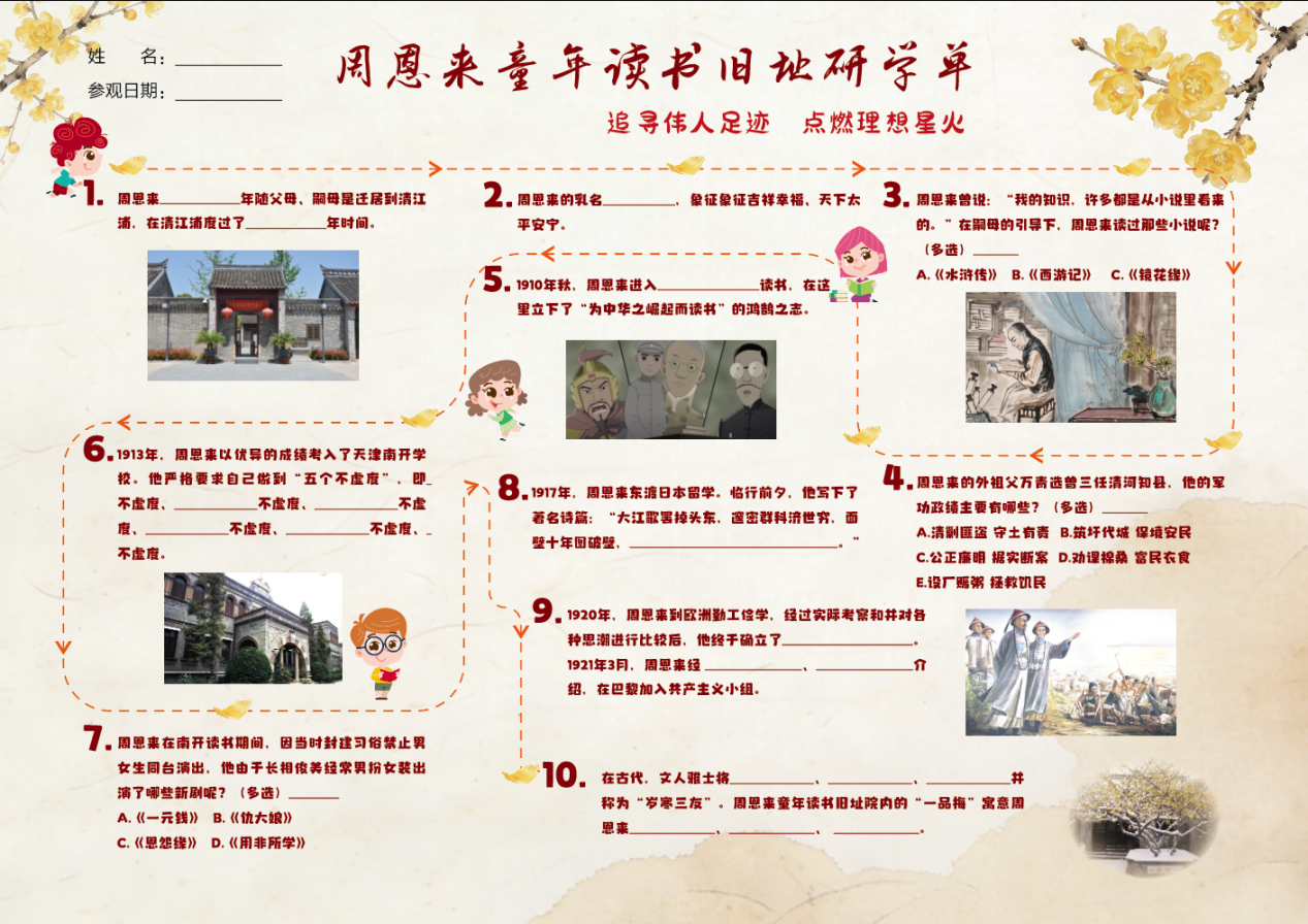 活动内容:活动期间,入园的中小学生可领取《周恩来童年读书旧址研学单》,在参观旧址的过程中细心观察、寻找历史线索,完成趣味答题,在沉浸式体验中走进周总理的童年时光,感受伟人精神的力量,让红色种子在心中生根发芽。